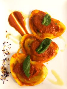 Cuore di raviolo ripieno con patate e gamberi